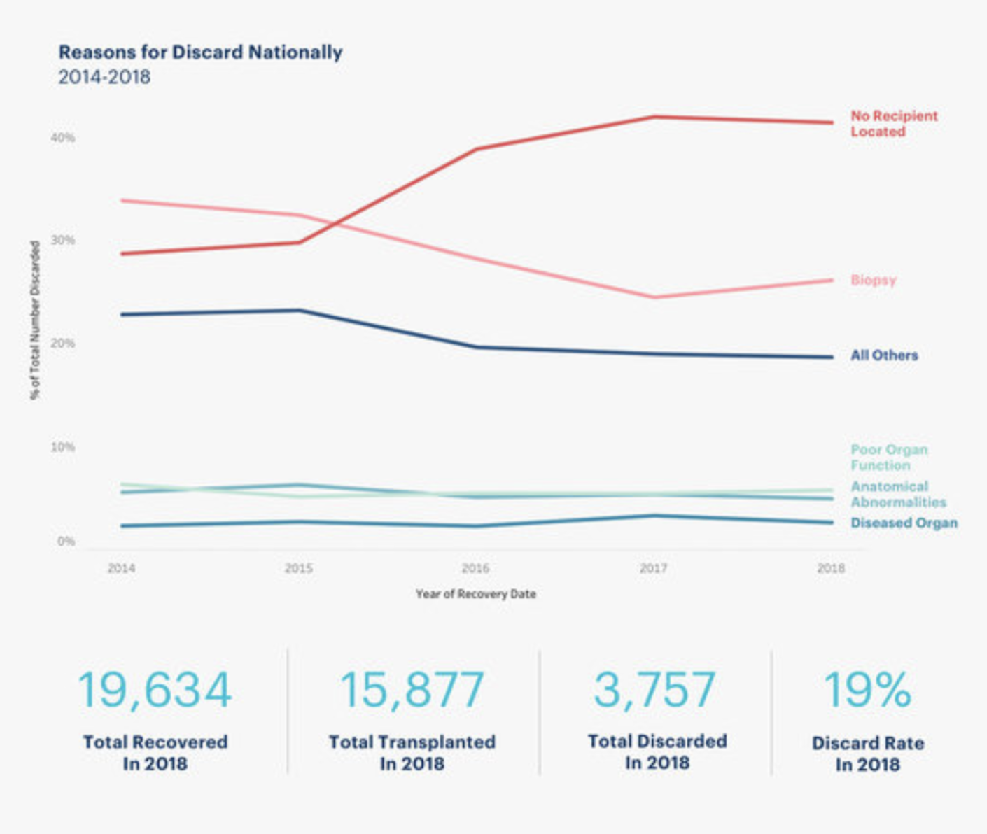 Twenty thousand kidneys are donated from deceased donors each year but twenty thousand new patients are diagnosed with ESRD each year. And with a hundred thousand patients already waiting for a kidney, the demand continuously outpaces the supply. Because of this, eleven people die every day waiting for a kidney transplant in the United States. To make matters worse, of all donated kidneys, about 19% are discarded instead of transplanted into patients.