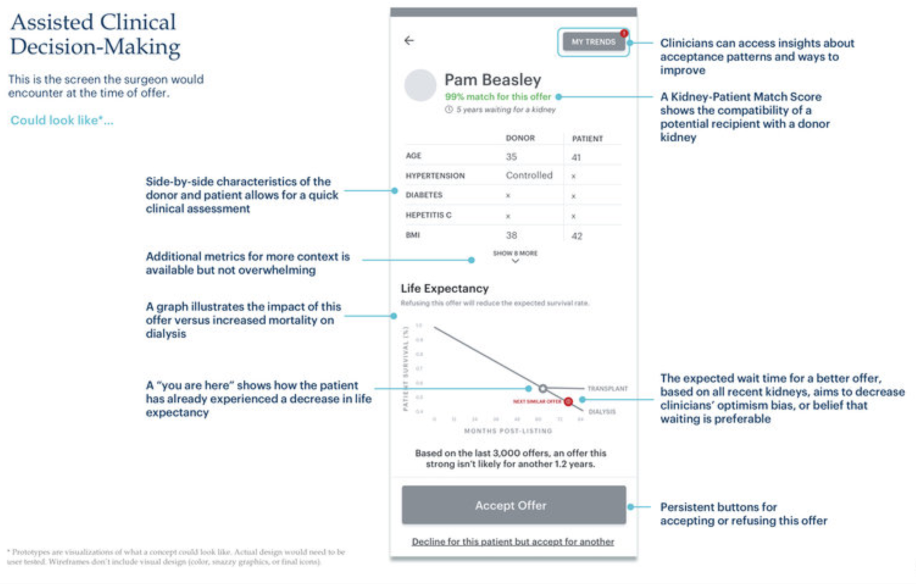 Another structural opportunity lies within defaults of the applications. For example, the current system requests users to give a "provisional yes" to an organ offer, versus a committed yes or no, which causes additional delays. In transplant center evaluation, we also discovered opportunities to create incentives, rather than just disincentives, which could inspire, rather than restrict, the natural curiosity and patient-centered drive of clinicians. Lastly, US policies could benefit from improved the nuance in matching, such as stratifying "old for old" — matching elderly donors with elderly recipients — existing policy in nations like France. These measures could decrease clinician burden and increase the opportunity to procure an expanded criteria of donors.